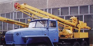 Спуско-подъемные операции и подача бурового инструмента на забой скважины производятся при помощи гидроцилиндра подачи, что обеспечивает оптимальное давление на забой, в том числе и при бурении пневмоударниками и позволяет вести высокоэффективное бурение по породам любой крепости. Управление установкой гидрофицировано и осуществляется с пульта управления. Обслуживают установку два человека.